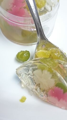 目で楽しみ舌で味わう心やすらぐ涼菓です 錦玉・撫子という竹芳さんの涼菓。ちょうどよい柔らかさの青えんどう豆、撫子をかたどった花びら…多くの工程を経てこの美しい涼菓は出来上がります。口の中でスッととけて消える程よい甘味、豆の風味が寒天の中から…